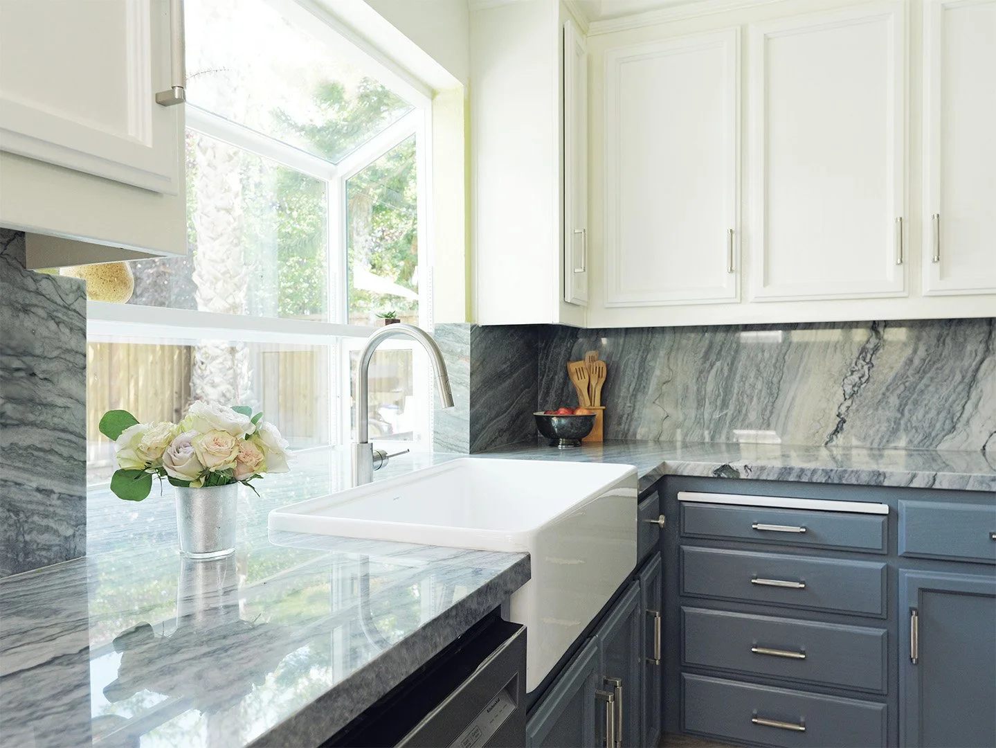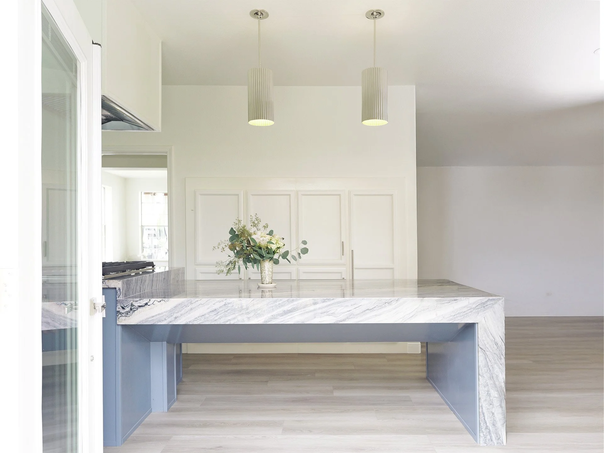 I custom-matched the blue cabinet paint to the quartzite slabs and selected hardware, lighting, appliances, flooring and lighting.