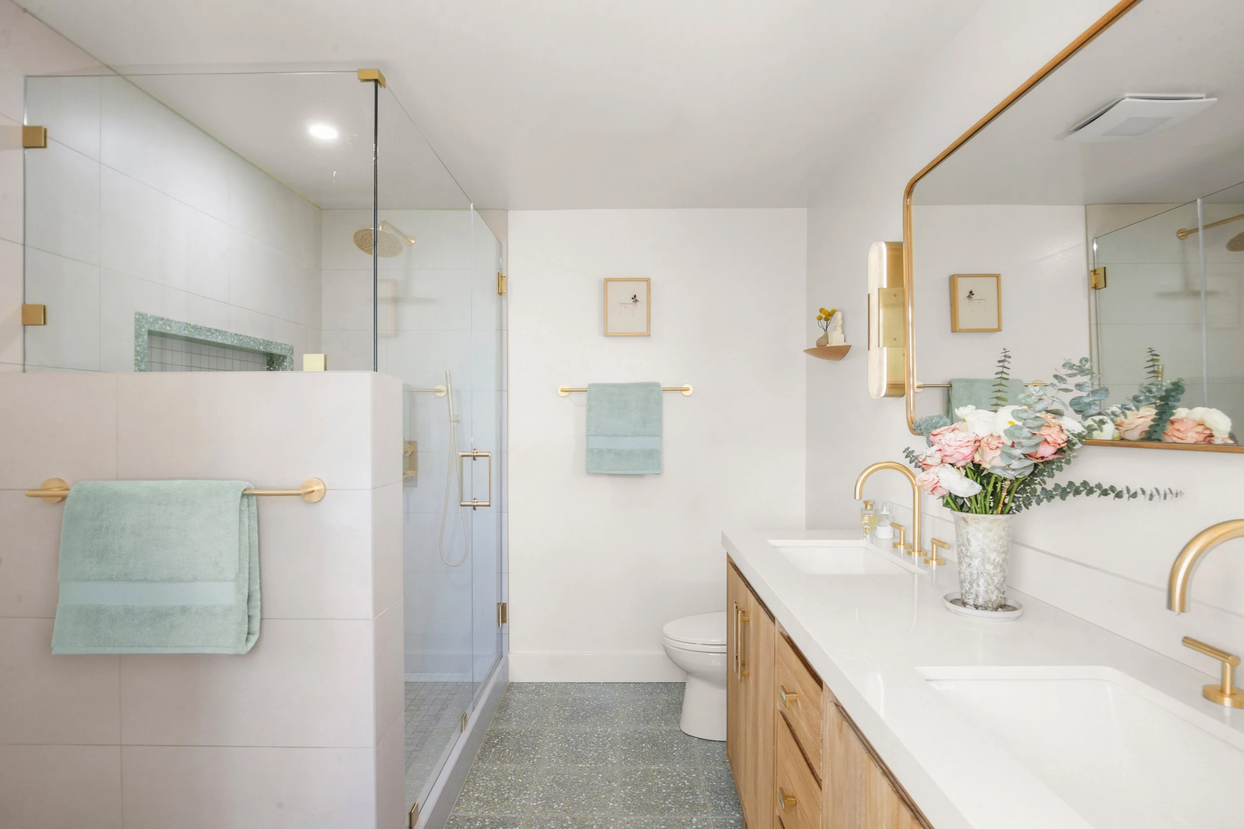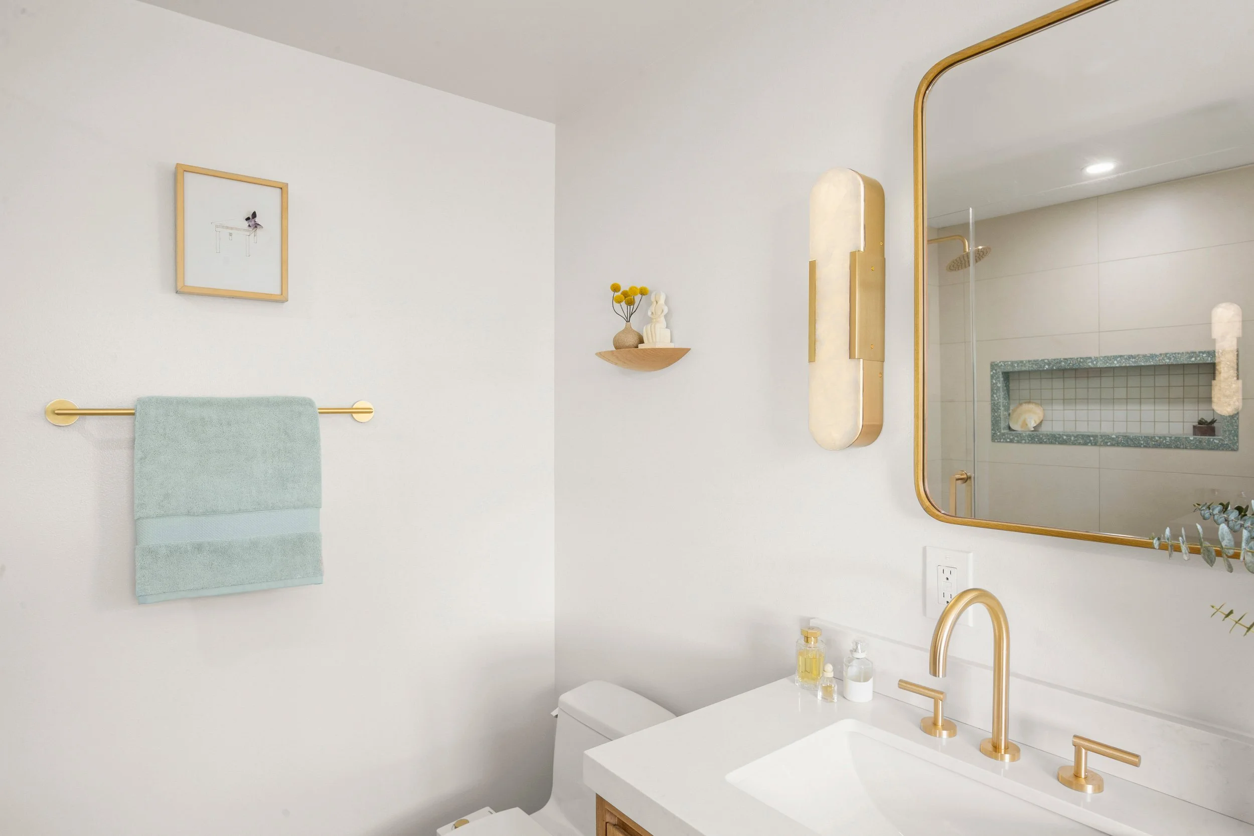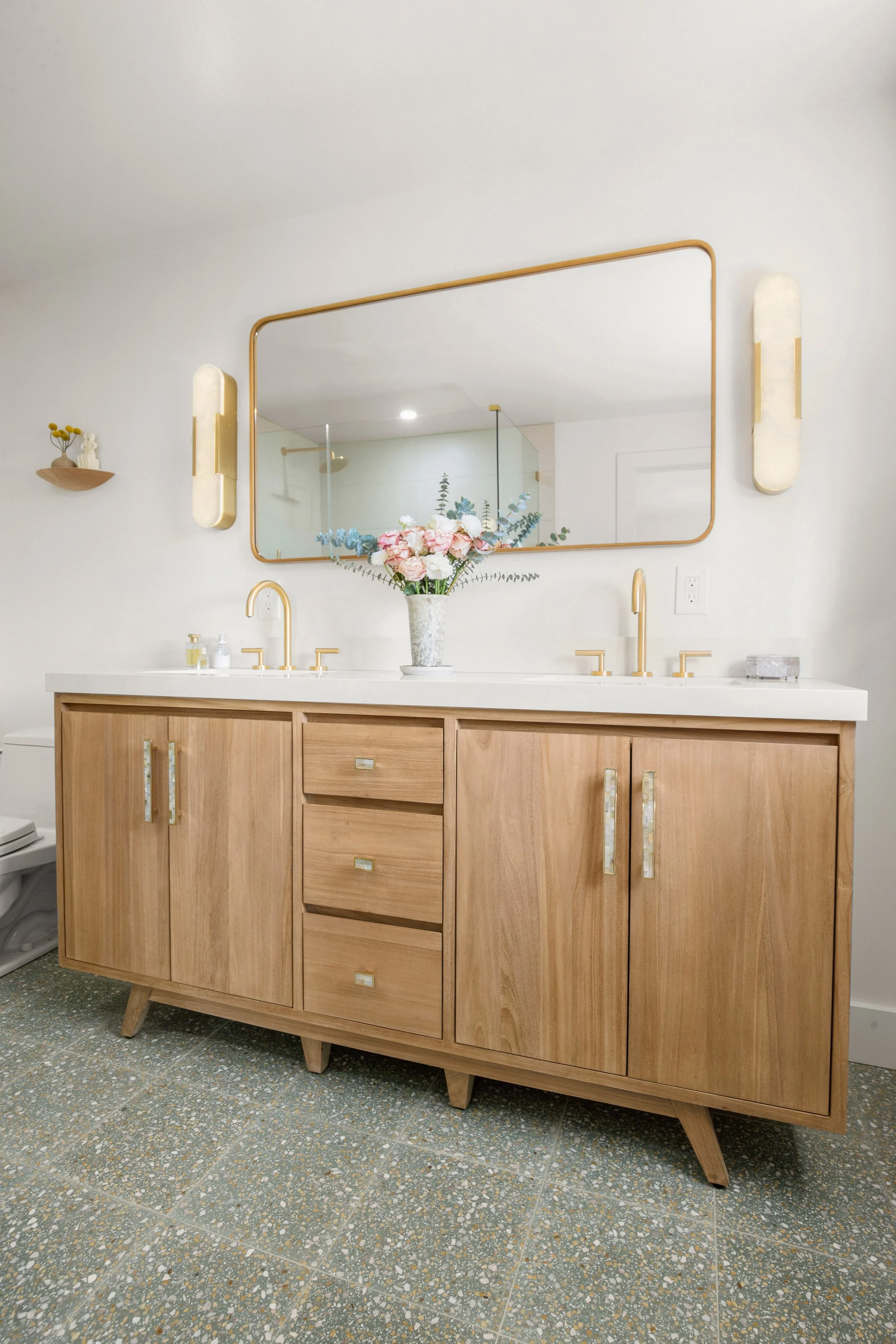 Inspired by this young couple’s travels to Greece, The Seaglass Bathroom features elements that echo the Aegean Sea: sun-kissed brass fixtures, alabaster sconces, and mother-of-pearl handles on the warm oak vanity are grounded by a seafoam green terrazzo tile. The double-wide mirror enlarges the ~77 sq ft bathroom.