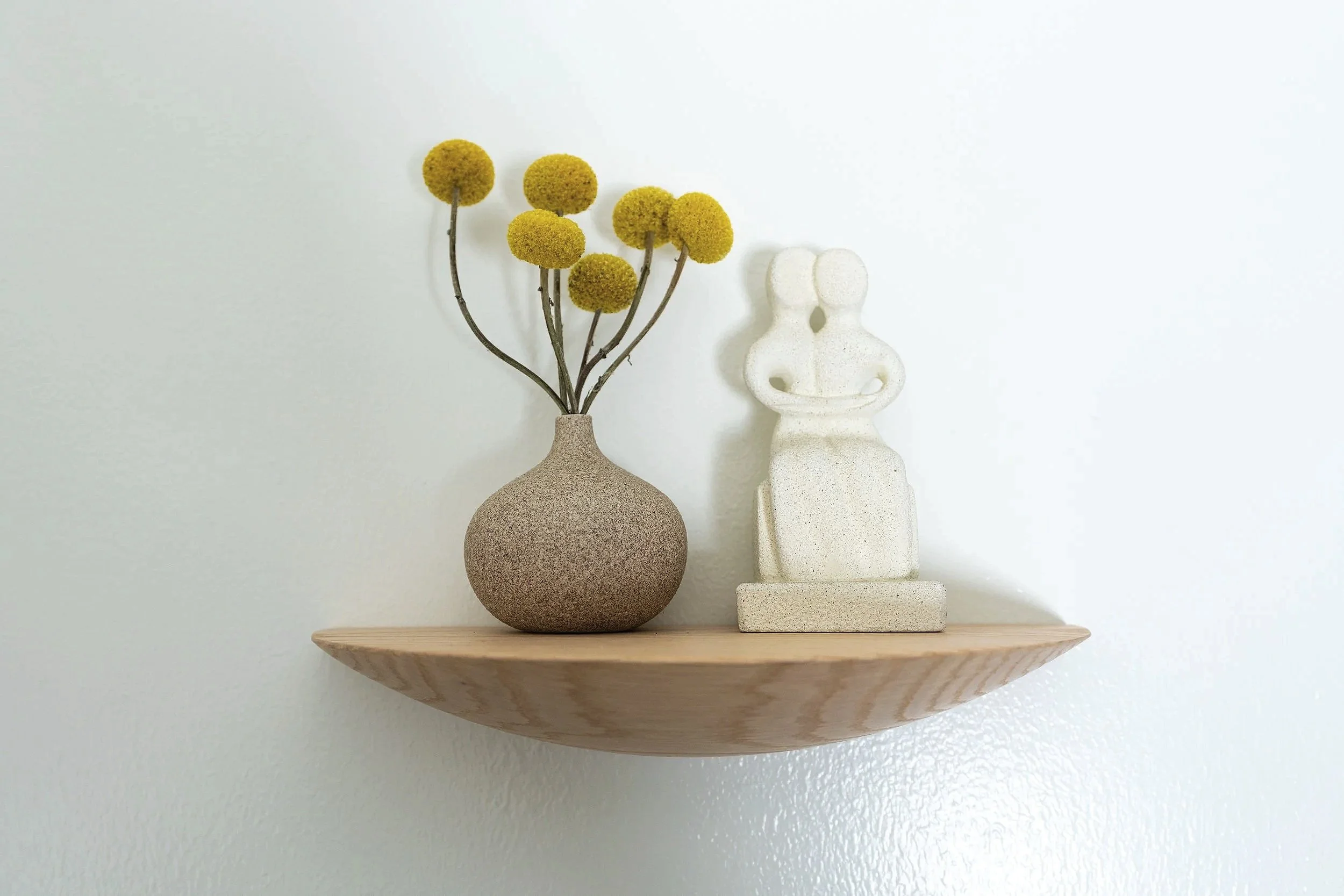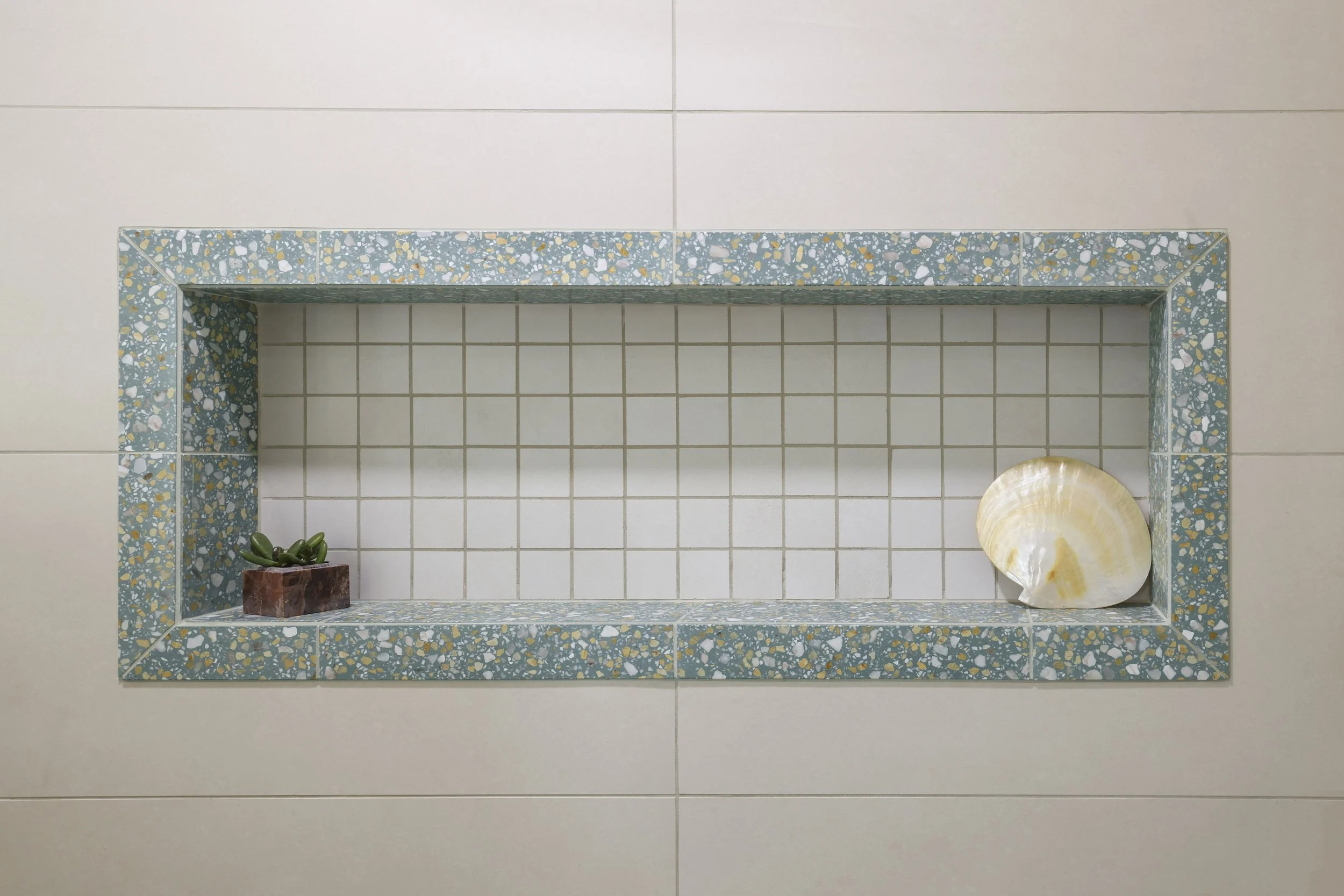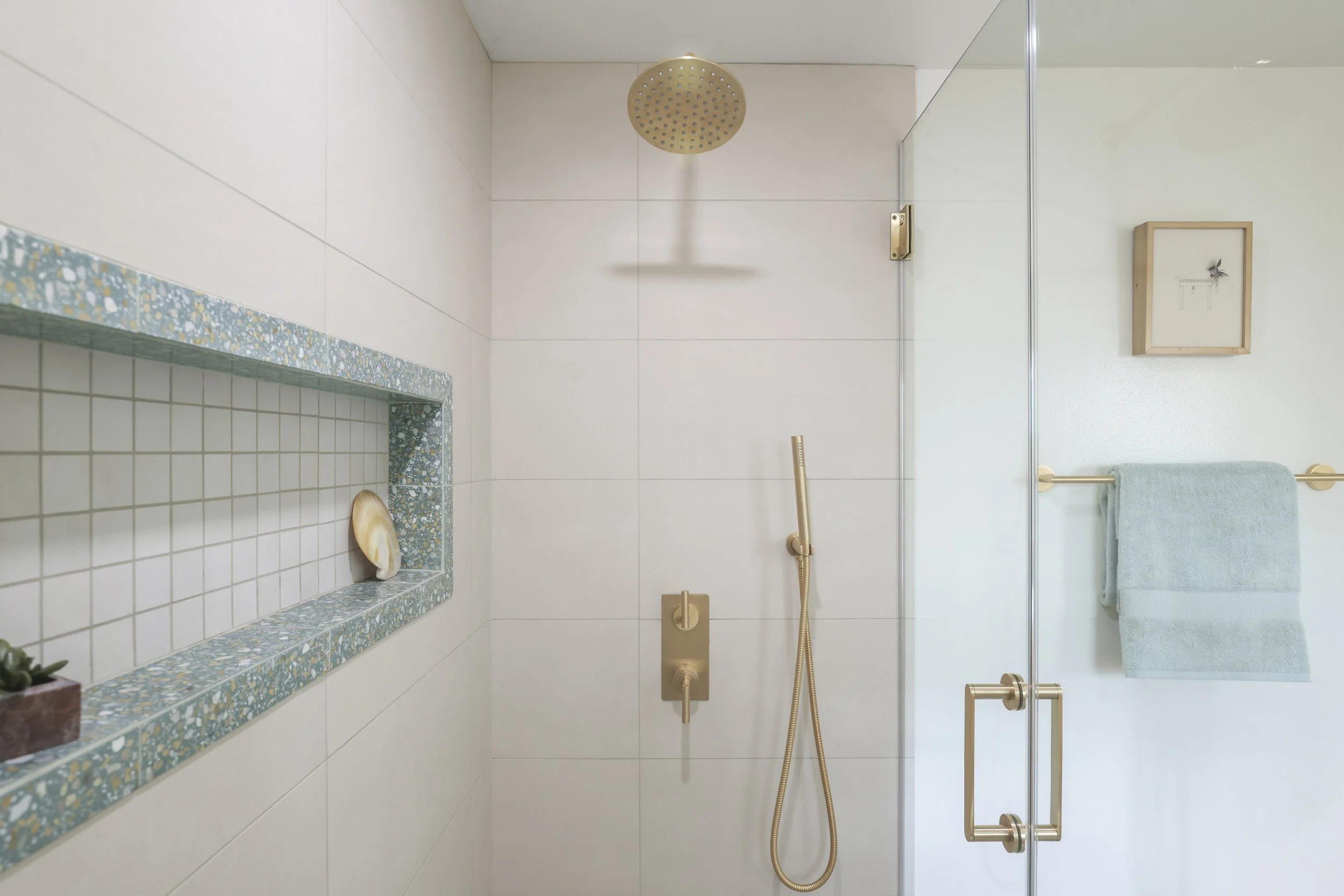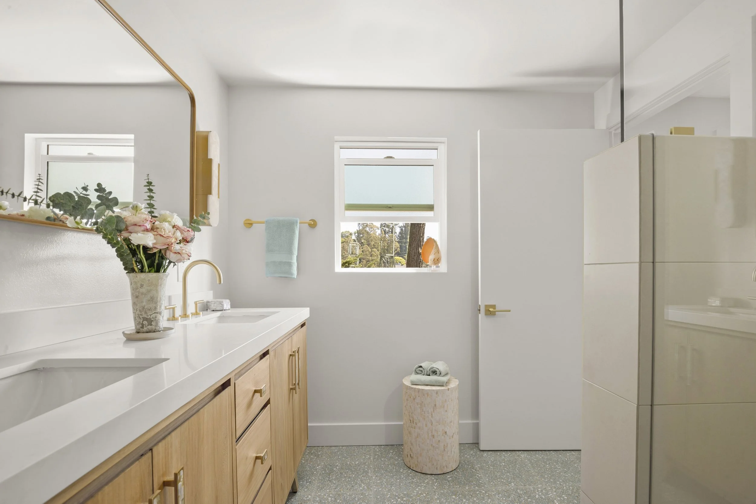 Inspired by this young couple’s travels to Greece, The Seaglass Bathroom features elements that echo the Aegean Sea: sun-kissed brass fixtures, alabaster sconces, and mother-of-pearl handles on the warm oak vanity are grounded by a seafoam green terrazzo tile. The double-wide mirror enlarges the ~77 sq ft bathroom.